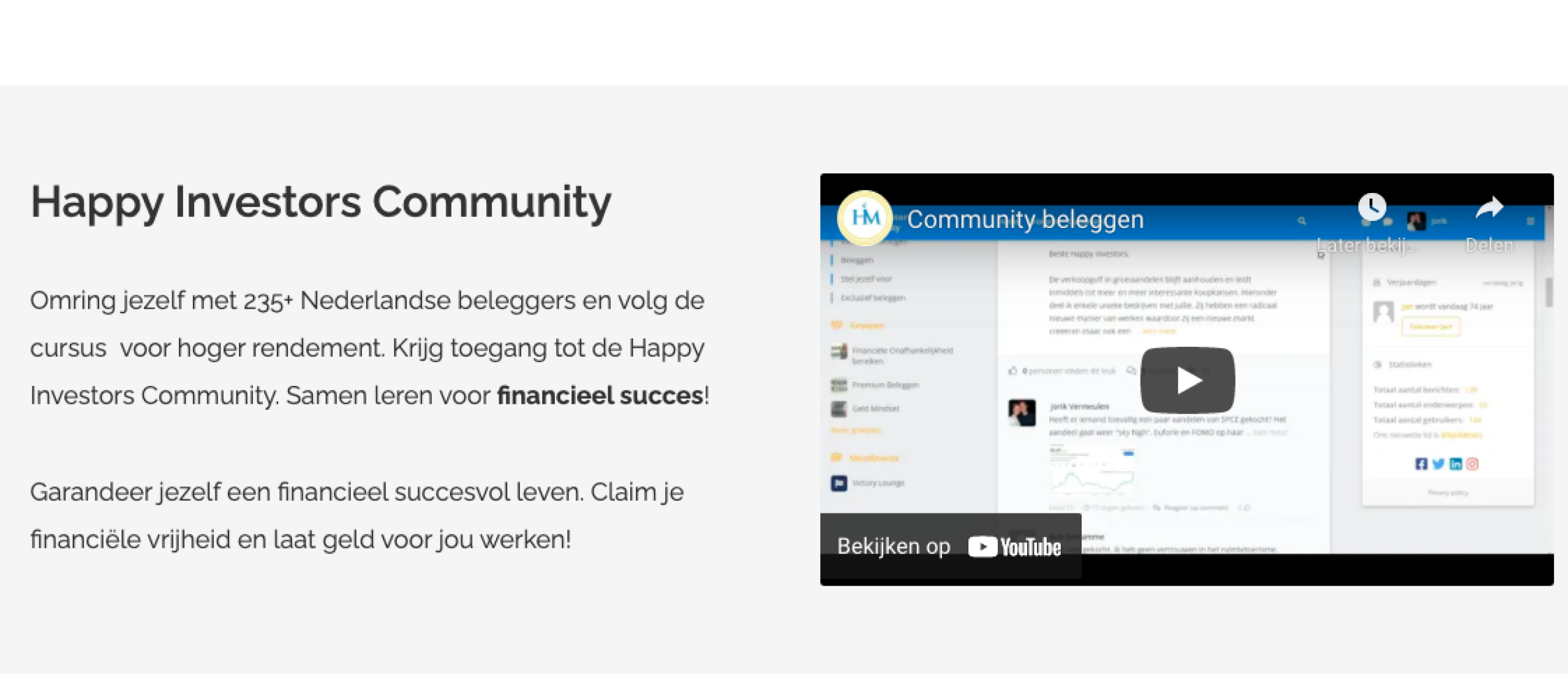 Nieuwsfeiten worden behandeld in de beleggingswereld, topics over hoe je geld kan besparen en noem maar op. Maar ook kun je hier vragen aan Jorik maar ook jouw gelijkgestemden, de andere beleggers (cursisten) stellen. De community is duidelijk groeiende en zeker de moeite waard om aan deel te nemen.