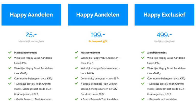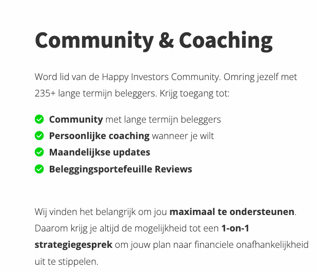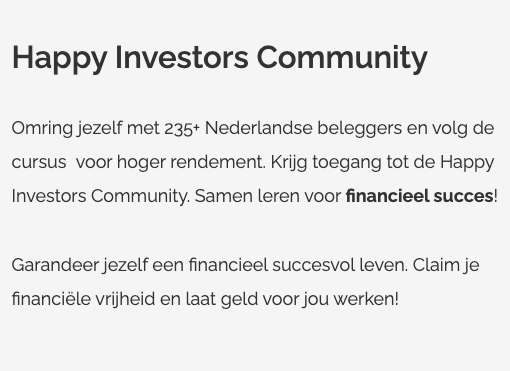 en onderzoek naar de beste aandelen met daarnaast onmiddellijke toegang tot de online community (Gelijkgestemde met veel kennis!) En als bonus, persoonlijke coaching van The Happy Investors met 200 en meer Nederlandse beleggers.